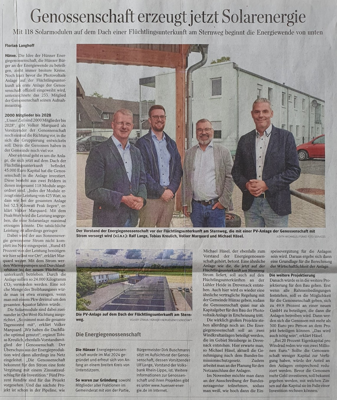 Liebe Mitglieder der HÜNXER ENERGIE Genossenschaft eG, wir haben in Zusammenarbeit mit der Gemeinde Hünxe und örtlichen Handwerkern das erste PV-Anlagen-Projekt realisiert. Mit der Inbetriebnahme der Anlage setzen wir ein weiteres sichtbares Zeichen für bürgerschaftliches Engagement und nachhaltige Energiegewinnung in unserer Gemeinde.