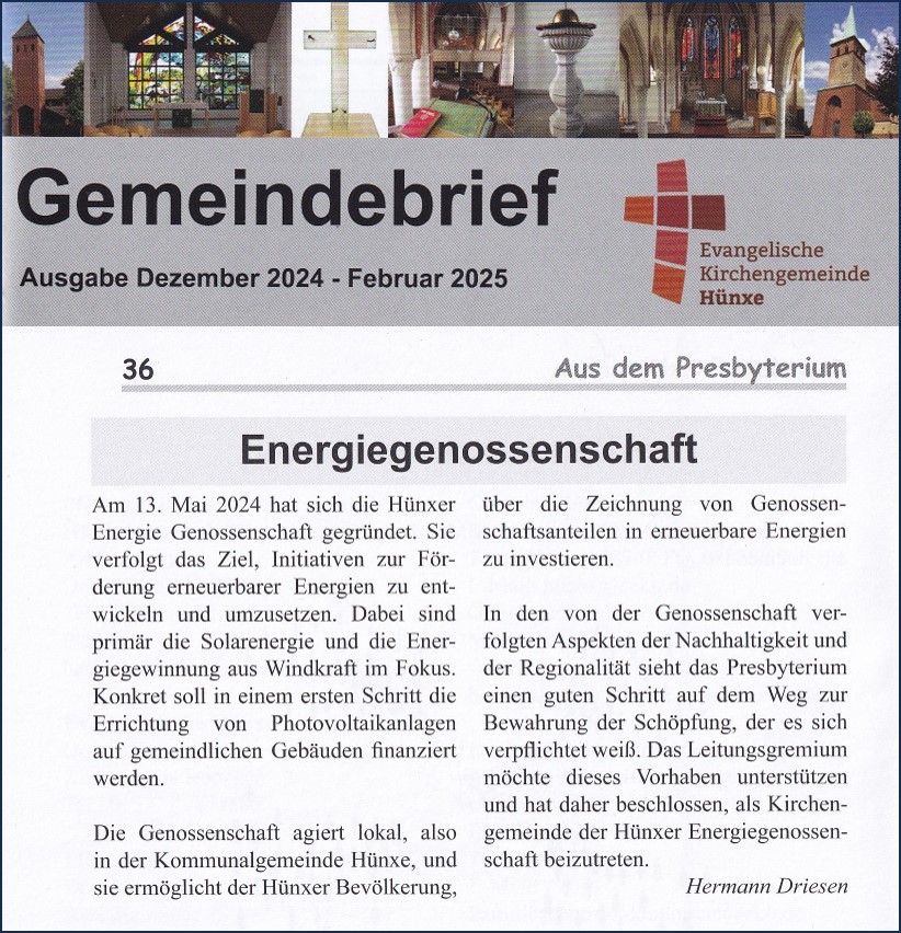 Wir freuen uns, die Evangelische Kirchengemeinde Hünxe als neues Mitglied in der HÜNXER ENERGIE Genossenschaft begrüßen zu dürfen.